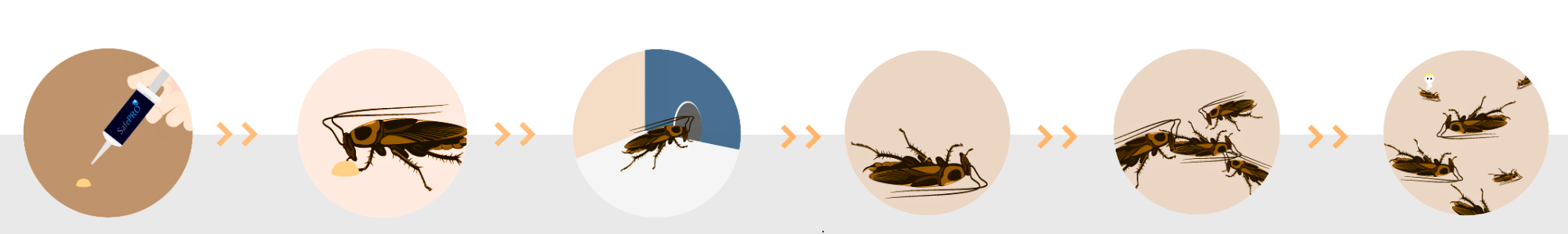 Actiunea gelurilor insecticide nu este una imediata, respectiv de eliminare a gandacilor ce au intrat in contact direct cu suprafata tratata (ca si in cazul insecticidelor de contact, aplicate prin pulverizare), ci este una mai lenta (dupa 24 ore), permitand ca efectul biocid (insecticid) sa se transmita si la ceilalti gandaci, pana la eliminarea totala a cuibului (efect in cascada sau domino).