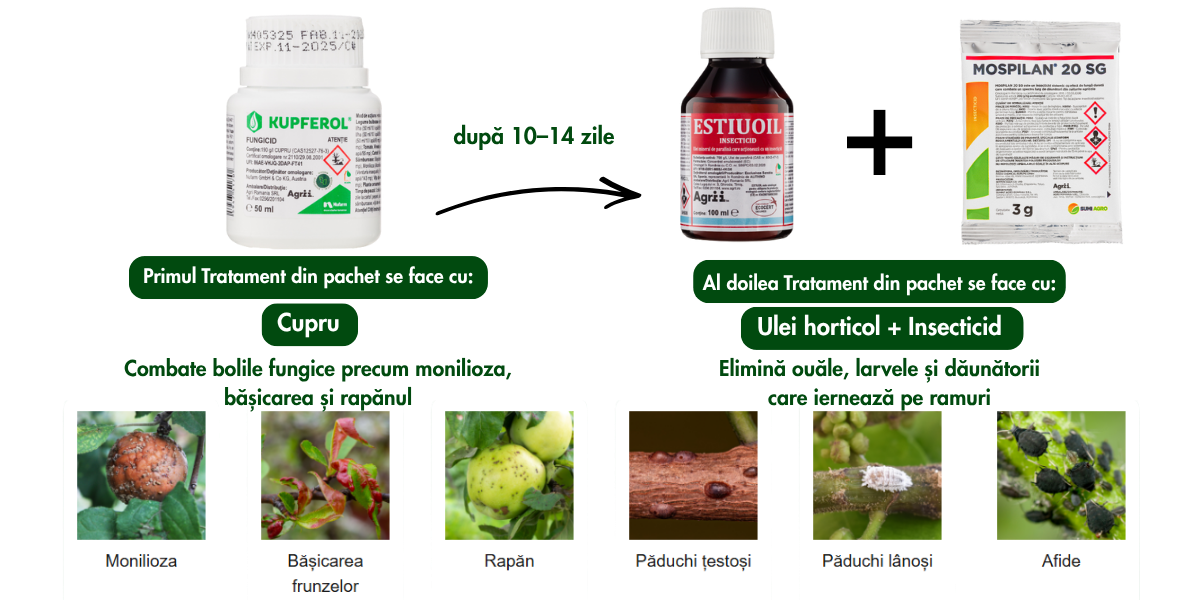 - Pentru a efectua ‘’stropirile de iarna’’, specialistii Agrii au create si testat un pachet special, Agrii Pack Tratament de Iarna, care contine atat fungicidul pe baza de cupru, cat si ulei horticol ce se aplica la 10-14 zile de la aplicarea produsului cupric.