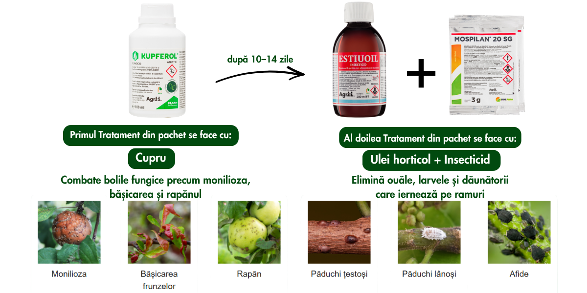 Primul tratament din pachet se efectueaza cu fungicidul KUPFEROL, un produs pe baza de cupru ce formeaza o pelicula protectoare care adera bine pe suprafata scoartei, ramurilor si a frunzelor cazute. Pe acestea, in perioada de inactivitate a pomilor, se formeaza si se dezvolta spori de rezistenta specifici patogenilor ce permit raspandirea bolilor de la un an la altul, odata ce s-a instalat infectia primara. Astfel, stropirea cu KUPFEROL are rolul de a intrerupe ciclul biologic al bolilor, dezinfectand si contribuind la maturarea lemnului si la asigurarea rezistentei la iernare.