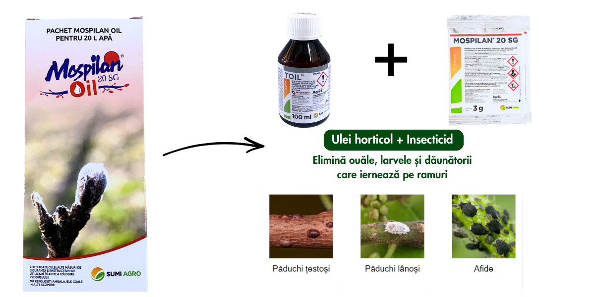 MOSPILAN OIL 20L este un pachet care se aplica din iarna pana la inceput de primavara, fiind special conceput pentru combaterea celor mai comuni daunatori care ataca pomii fructiferi in vegetatie. Combinatia dintre insecticidul sistemic Mospilan si uleiul vegetal Toil asigura un start sigur in noul sezon, intrucat rezerva de daunatori ( Paduchi Testosi, Paduchi Landosi, Afide) care ierneaza sub scoarta va fi redusa datorita stratului protector al celor doua produse din pachet care va axfisia oule sau larvele acestora.